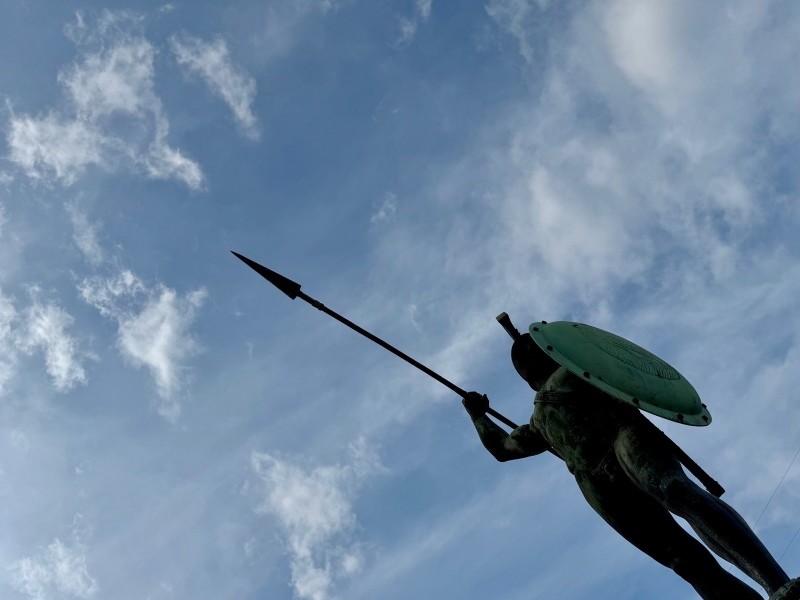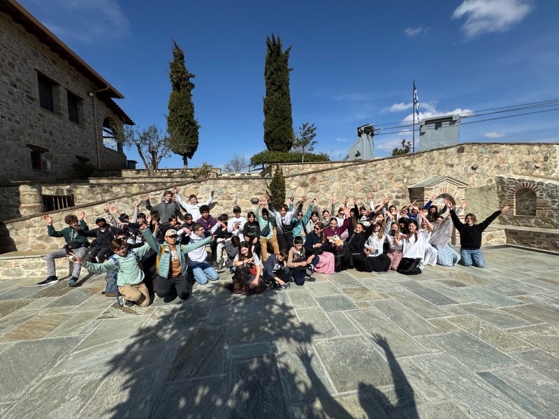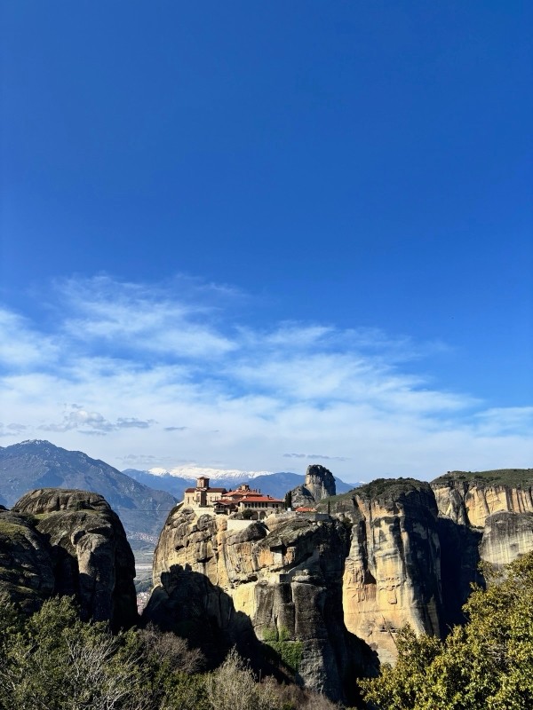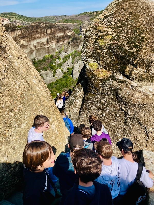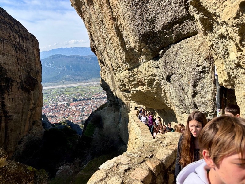 " Aujourd'hui, vendredi 6 mars, élévation des pensées au cœur des Météores, dans un paysage à la beauté époustouflante ! Mme Svoboda nous a expliqué avec brio ce mille-feuilles géologique étonnant dont l'ascension a galbé nos mollets... De retour dans le bus pour filer en direction du sud, nous avons héroïquement franchi les Thermopyles où Léonidas nous attendaient, un peu figé."